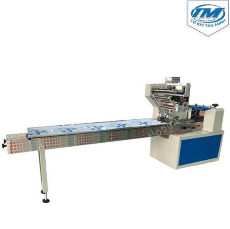 -Máy đóng gói ngang thực hiện việc đóng gói theo phương nằm ngang. Sản phẩm được cung cấp theo phương nằm ngang trên băng tải của máy. Cũng theo phương đó  vừa thực hiện cung cấp film cuộn  màng vừa tạo túi, vừa tiến hành đóng gói.